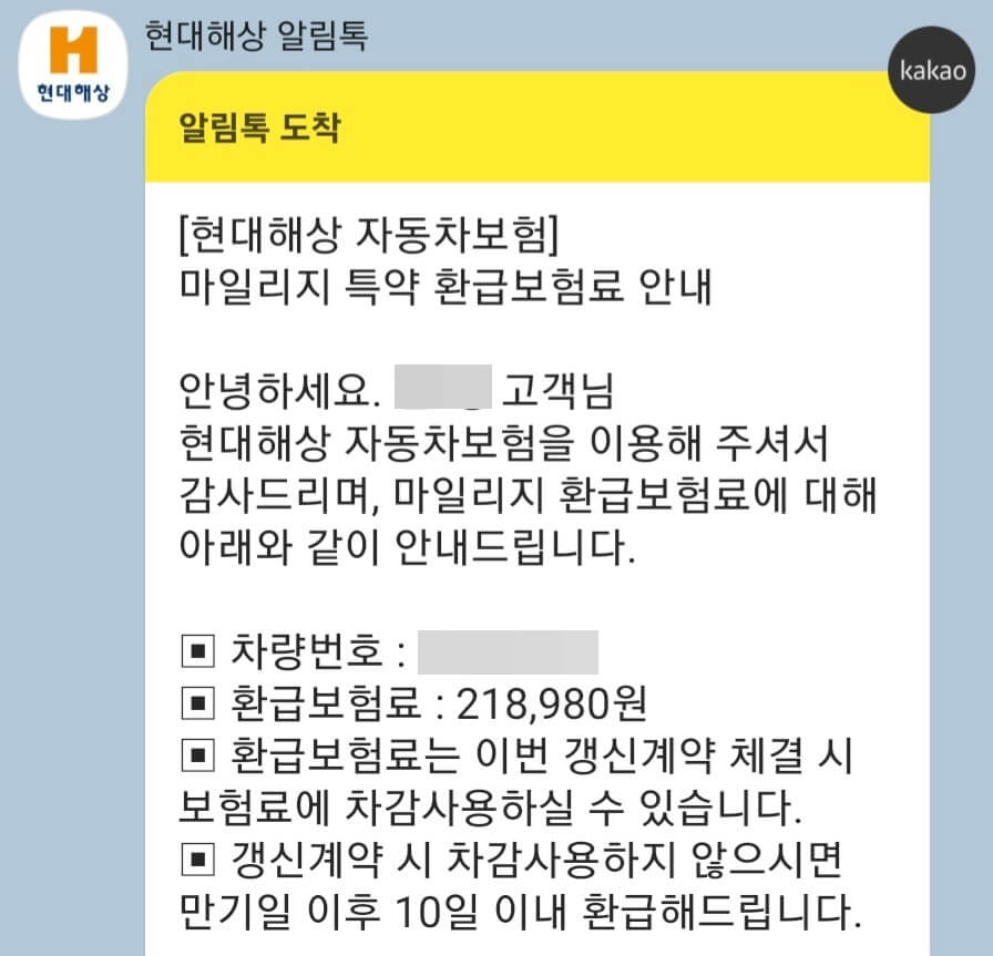 하루만에 마일리지 특약 환급보험료 안내라는 카톡 알림이 온다.